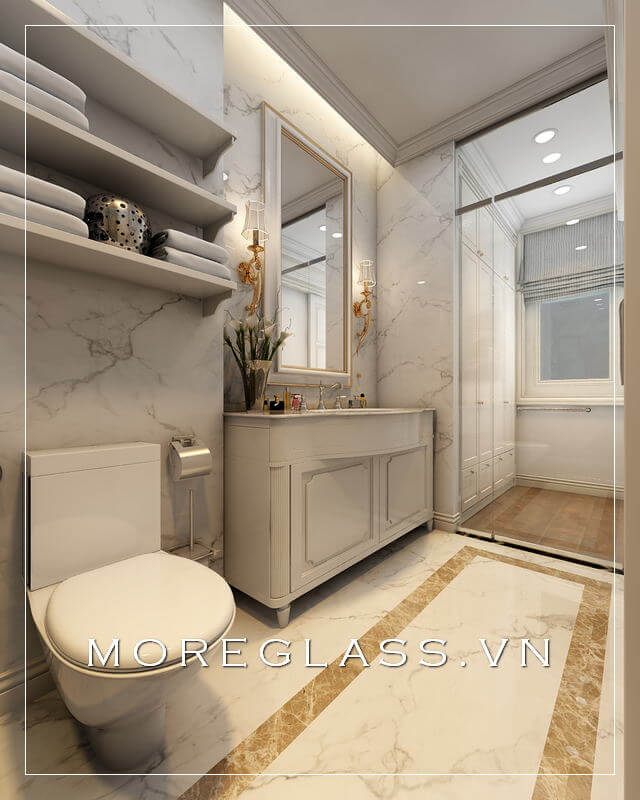 Mẫu thiết kế phòng vệ sinh đẹp được trang bị nội thất cao cấp có màu trắng sang trọng, phù hợp với không gian nhà biệt thự.