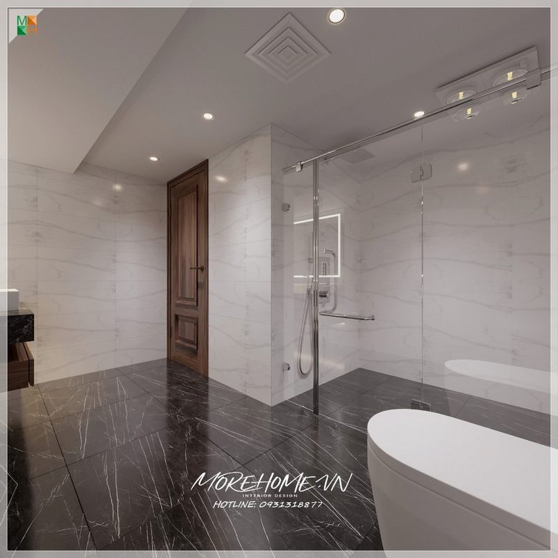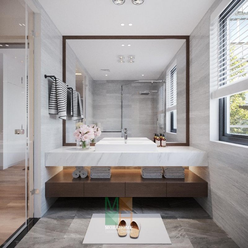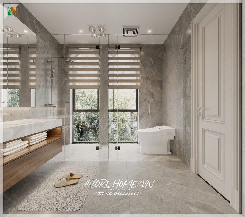 Sử dụng tông màu sáng để thiết kế phòng tắm nội thất, góp phần tạo nên không gian rộng rãi và thông thoáng, cùng với phong cách hiện đại và tiện nghi.