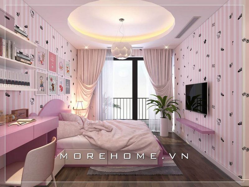 Thiết kế nội thất phòng ngủ của bé gái với gam màu hồng phấn sẽ tạo nên một cảnh ấn tượng, dễ thương và nhẹ nhàng hơn cho cô bé.